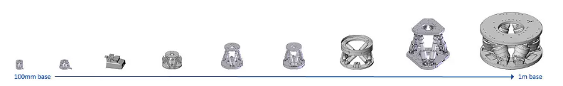 Hexapod 6-axis stage motion systems come in different sizes for application from alignment of tiny fiber-optics and silicon photonics components to controlling the motion of heavy optics and reflectors in astronomical telescopes.
