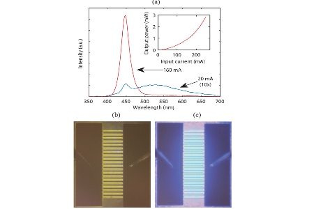 At low injection of 20mA, most of the electroluminescence is in a broad yellow band. At high injection, e.g. 160mA, the yellow band disappears, leaving the 450nm wavelength of the MQW. The measured output power was for light emitted through the back-side of the device.