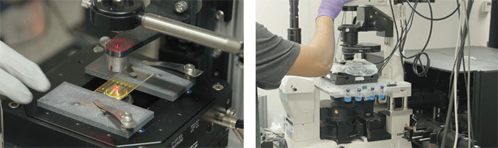 The P-527 nanopositioning stage on top of the U-751 long travel piezo motor stage inside the microscope. (Source: The Wyss Institute)