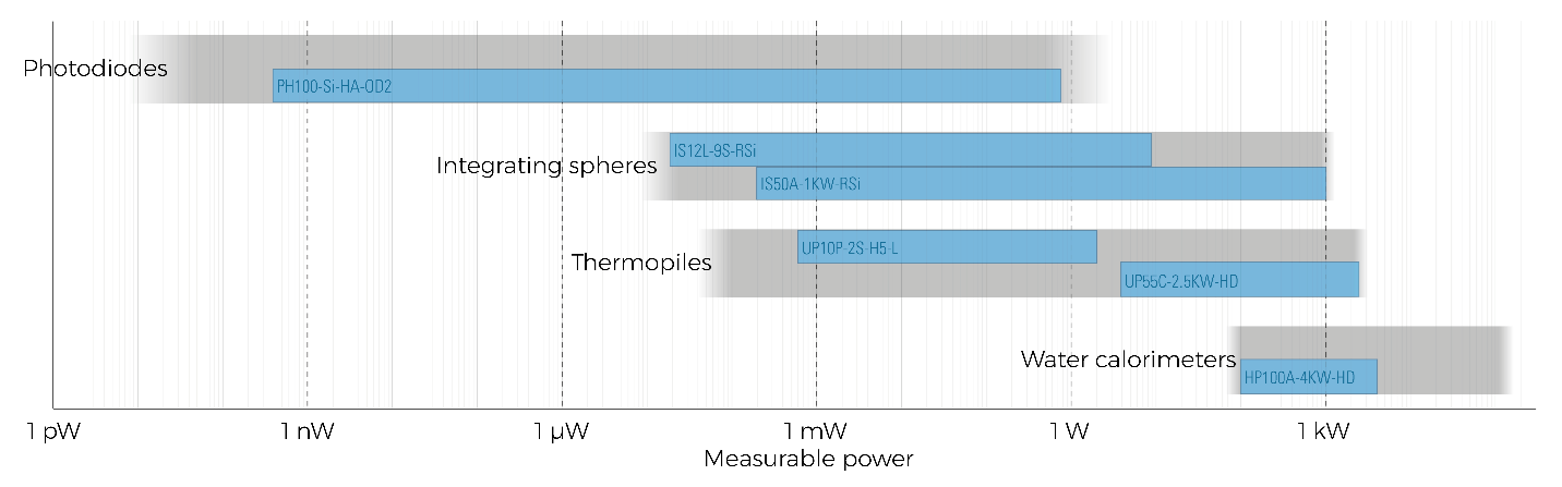 Also, the very large dynamic range of this product makes it possible to measure from very low (under the microwatts) to very high (up to 1000 W) with only one detector.