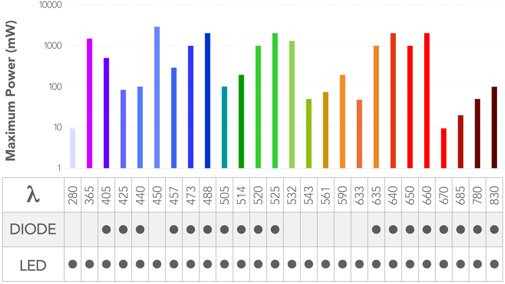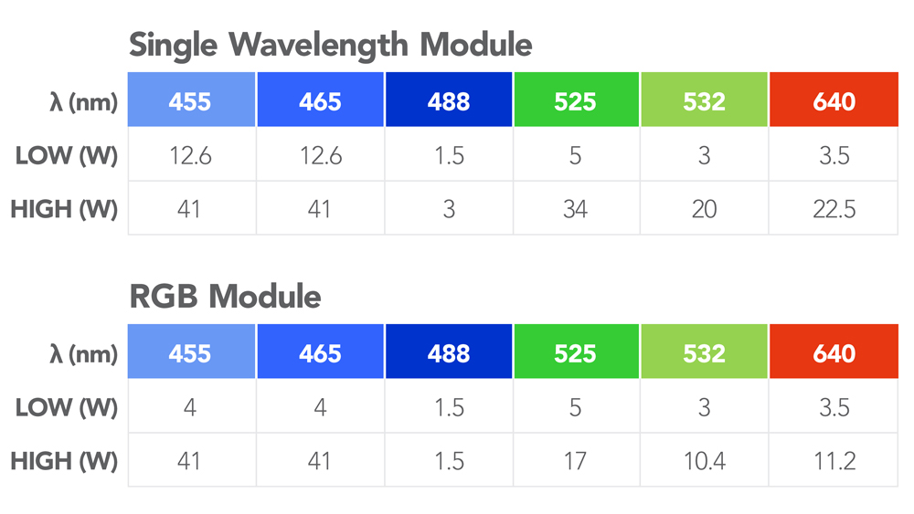 High-power options are offered in some discrete RGB bands as a result of the innovative work conducted by IDEX Health & Science in order to offer higher power solutions. This aids the trend in many markets to higher throughput enabled by wider fields of view or faster TDI scanning. Both solutions require higher power / irradiance at the sample plane.