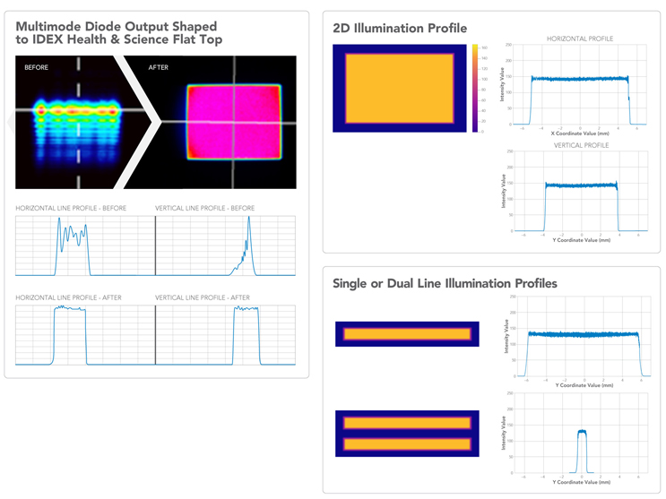 Our proprietary beam shaping technologies produce flat-top, speckle-free illumination with uniformity exceeding 85% for both 2D and line illumination. This ensures consistent signal across the entire field of view, maximizing data quality and throughput. Our primary method of delivery offers steep edges and a highly uniformed image. In certain applications, a more traditional critical illumination delivery may be adequate where the fiber face is re-imaged to the sample plane. At IDEX Health & Science, we have flexible delivery solutions that enable a quick turn module to be delivered with the core laser engine that matches the needs of the customers field of view.