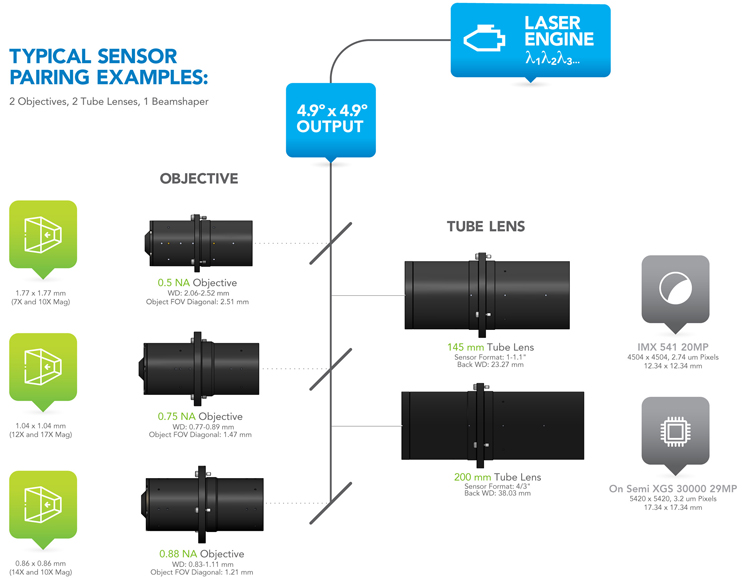 We offer a series of wide field of view objective lenses at specific NA’s. Illumination Beamshaper modules are available that are designed to work with the XPLAN series and their complementary wide field of sensors. See figure 3.