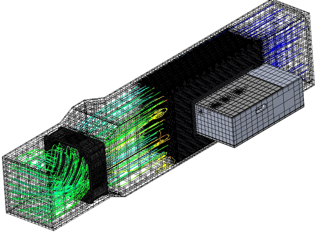 Finite element model of an air cooled 16W fiber coupled laser showing airflow.