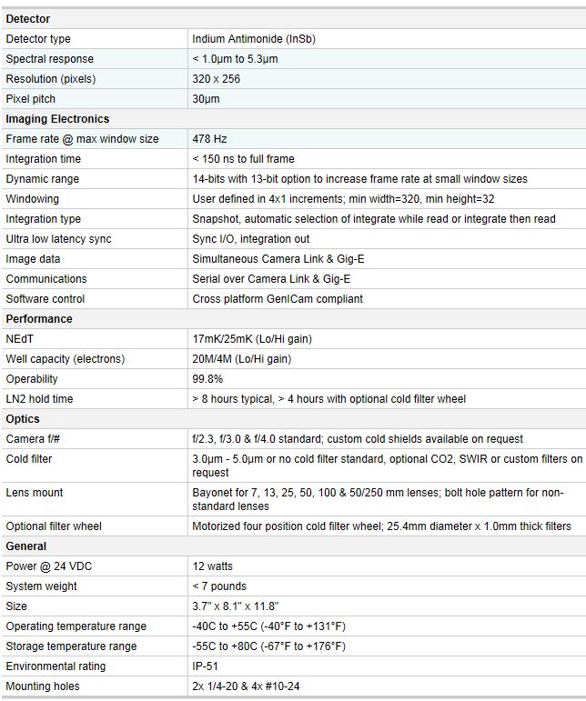 The IRC803 is an Indium Antimonide (InSb) Mid-Wave Infrared (MWIR) camera with a 320 x 256 pixel resolution, a 30µm pixel pitch, and a full frame rate of 478 fps.