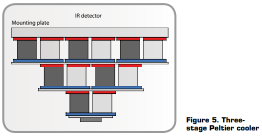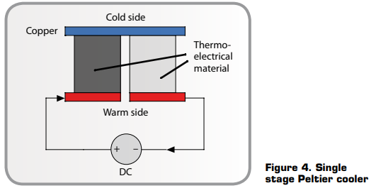 Later, other cooling methods were developed. The first solid-state solution to the cooling problem was presented by AGEMA in 1986, when it introduced a Peltier effect cooler for a commercial IR camera. In a Peltier cooler, DC current is forced through a thermoelectric material, removing heat from one junction and creating a cold side and a hot side. The hot side is connected to a heat sink, whereas the cold side cools the component attached to it. See Figures 4 and 5.
