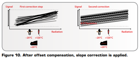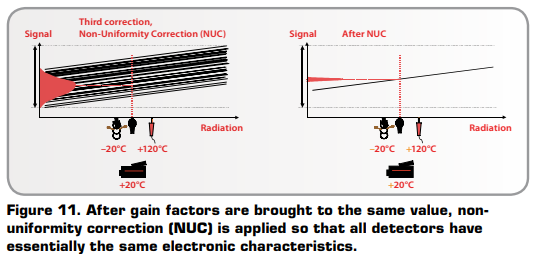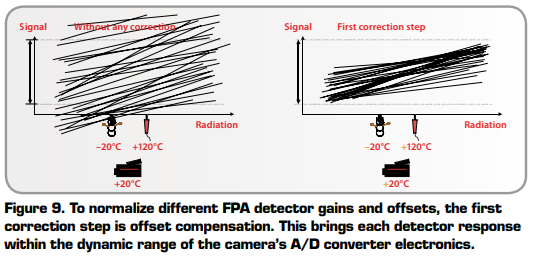 Another complexity is the fact that each individual detector in the FPA has a slightly different gain and zero offset. To create a useful thermographic image, the different gains and offsets must be corrected to a normalized value. This multi-step calibration process is performed by the camera software. See Figures 9–11.