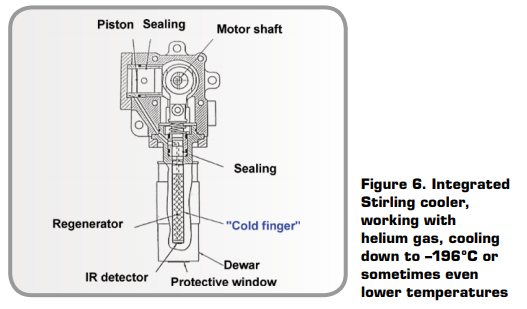 The Stirling process removes heat from the cold finger (Figure 6) and dissipates it at the warm side. The efficiency of this type of cooler is relatively low, but good enough for cooling an IR camera detector. Regardless of the cooling method, the detector focal plane is attached to the cold side of the cooler in a way that allows efficient conductive heat exchange. Because focal plane arrays are small, the attachment area and the cooler itself can be relatively small.