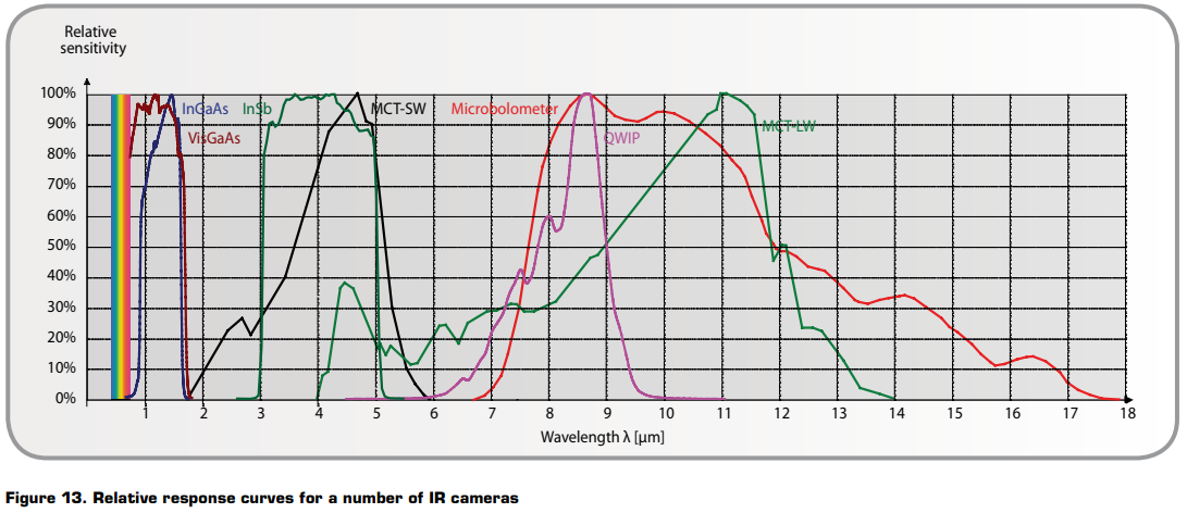 Price aside, spectral sensitivity is often an overriding concern in selecting a detector and camera for a specific application. Once a detector is selected, lens material and filters can be selected to somewhat alter the overall response characteristics of an IR camera system. Figure 13 shows the system response for a number of different detectors.