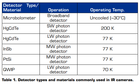 For more demanding applications, quantum detectors are used, which operate on the basis of an intrinsic photoelectric effect. These materials respond to IR by absorbing photons that elevate the material's electrons to a higher energy state, causing a change in conductivity, voltage, or current. By cooling these detectors to cryogenic temperatures, they can be very sensitive to the IR that is focused on them. They also react very quickly to changes in IR levels (i.e., temperatures), having a constant response time on the order of 1µs. Therefore, a camera with this type of detector is very useful in recording transient thermal events. Still, quantum detectors have response curves with detectivity that varies strongly with wavelength (Figure 2). Table 1 lists some of the most commonly used detectors in today's IR cameras.