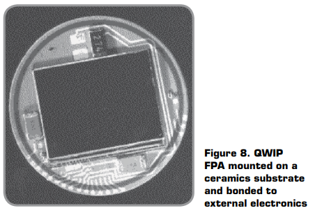 In reality, assemblies are a bit more complex. Depending on the detector material and its operating principle, an optical grating may be part of the FPA assembly. This is the case for QWIP detectors, in which the optical grating disperses incident radiation to take advantage of directional sensitivity in the detector material's crystal lattice. This has the effect of increasing overall sensitivity of a QWIP detector. Furthermore, the FPA must be bonded to the IR camera readout electronics. A finished QWIP detector and IC electronics assembly is shown in Figure 8. This would be incorporated with a Dewar or Stirling cooler in an assembly similar to those shown in Figure 7.