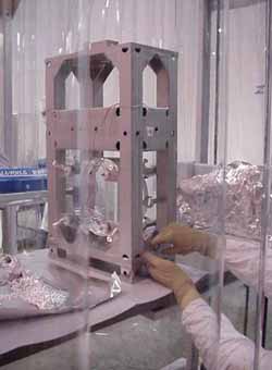 Figure 2: Cavity mirror for one of the LIGO interferometers is suspended by a single wire inside a metal cage. The mounting system is designed to insulate the mirror from as much thermal noise and vibration as possible. (Courtesy of LIGO Laboratory).