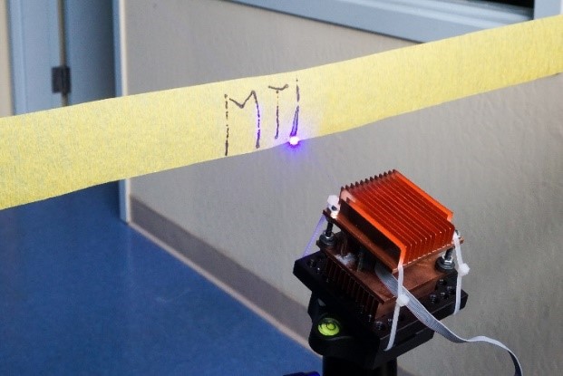 Figure 1. Mirrorcle laser-cuts ribbon to new cleanroom facility using a new product 1W blue laser (450nm) Scan Module. A crowd of visitors witnesses ribbon-cutting spectacle.