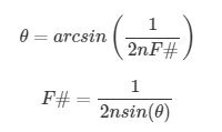 Both numerical aperture (NA) and f-number (F#) are alternate properties used to describe the cone of a beam. The following formulas derived using Abbe’s Sine Condition relate CHA and f-number: