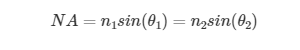 Numerical aperture is defined as the product of the incident medium refractive index and the sin of the CHA. A variation of Snell’s law shows that NA will remain constant as light passes through different media: