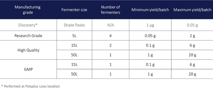 The manufacturing process uses different fermenter sizes in order to provide the desired quantities of plasmid DNA and therefore meet the needs for different applications.