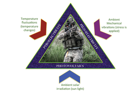 Energy harvesting — also called energy scavenging or power harvesting — is the process by which ambient energy is captured and converted into electricity for small autonomous devices, such as satellites, laptops, and nodes in sensor networks, making them self-sufficient. In recent years, research on energy harvesters for medical, military, industrial, and commercial applications has greatly increased due to the harvesters’ instantaneous energy delivery, flexibility, and portability. Military applications are of particular interest, since energy harvesters are soldier-friendly, enhancing warriors’ capabilities in long-range and multifaceted battlefield endeavors. Power-harvesting technologies, operating with dependable efficiency, open the door to a host of new applications for a soldier’s wearable devices and other portable military electronics.