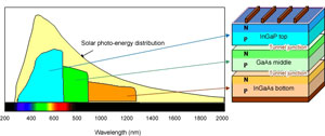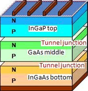 Compound solar cells utilize photo-absorption layers made from compounds consisting of two or more elements, such as indium and gallium. The basic structure of this latest triple-junction compound solar cell uses proprietary Sharp technology that enables efficient stacking of the three photo-absorption layers, with InGaAs (indium gallium arsenide) as the bottom layer.