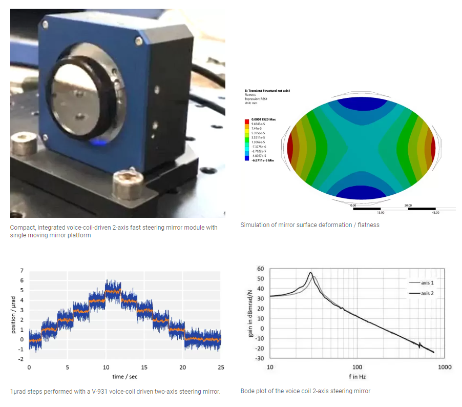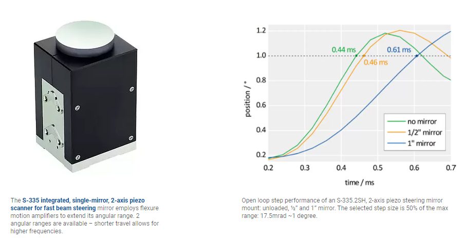 - Piezoelectric solid-state properties provide for fast response (sub-millisecond) and high resolution (down to the nanoradian range).
