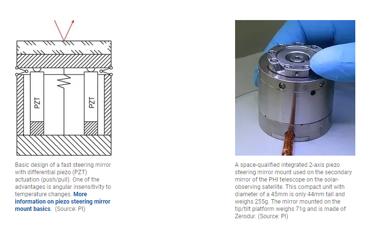 For high-bandwidth, closed-loop operation and linearization, strain gauges are integrated in the piezo steering mirrors. A differential drive design with two actuator pairs operating in push pull, improves the angular stability across different temperature ranges significantly compared to a single actuator/axis approach.