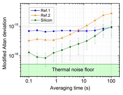 The new all-silicon unit was tested for 24 hours against two of the best-performing conventional ULE-based optical cavity-stabilized lasers – one from JILA and one from PTB, with thermal noise variation in the range of 6 X 10-16 and 2 X 10-16respectively. The results, Ye says, “show that the all-silicon system surpasses the performance of any other optical cavities ever reported.” As a long-term stable frequency reference, a preliminary test has shown that it is equivalent to the stability of a hydrogen maser at time intervals up to 1,000 seconds.
