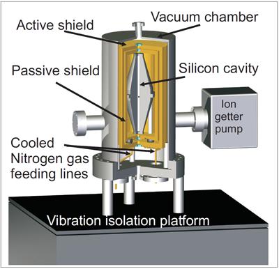 Single-crystal silicon has a coefficient of thermal expansion that approaches zero at 124 K, “so an all-silicon interferometer can be made insensitive to temperature fluctuations” at that point, the authors write in Nature Photonics. In addition, at 124 K the crystal has a much lower mechanical loss compared to conventional optical glass, and a much higher Young’s modulus. Both mechanical properties combine to minimize the fundamental thermal fluctuations. The group used extensive computer modeling to create a design that reduced the effects of environmental vibrations on the 21 cm long resonator, which they mounted in a vertical configuration after testing its response to external forces in all three dimensions.