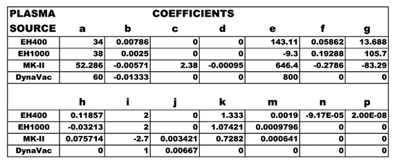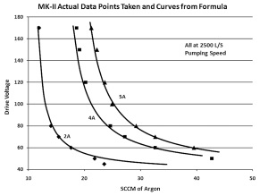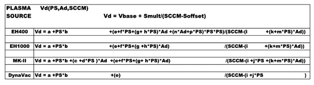 Tables 1 and 2 give the equations and coefficients which can be used in a spreadsheet to predict the Vd to be expected from any of these sources as a function of PS, SCCM, and Ad. Plots, such as those in Figures 4 and 5, can be generated. These show the similarities and differences between the MK-II and the K&R EH1000.