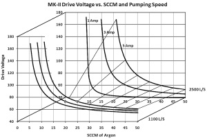 The entire family of these “gridless” sources has similar behavior, and four were studied and compared [2]. It was found that their performance could be predicted by a simple equation. Figure 3 shows actual measured data points in drive volts (Vd, a measure of eV) on an MK-II as a function of gas flow in standard cubic centimeters per minute (SCCM). It also shows drive current (Ad) in a chamber with a pumping speed (PS) of 2500 liters per second. This is also a function of chamber PS, which is generally fixed in a given chamber.