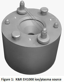 One typical ion/plasma source can be seen in Figure 1. This is a picture of a Kaufmann and Robinson (K&R) EH1000 source, and it is similar to the well known MK-II, originally from Commonwealth Scientific (now Veeco). Figure 2 is a sketch of the interior of an MK-II, but the principles of operation are the same for all of the sources described in this article. The gas to be ionized enters from below into an area of strong magnetic field. Electrons are “boiled” off of a heated tungsten cathode filament. They then travel upward to the substrate for neutralization, and downward into the throat of the anode to help ionize the gas (typically argon, oxygen, or a mix). The ionized gas is repelled upward by the high voltage anode. These ions will typically have an energy from 60 to 180 eV, and they bombard the depositing material forming the film. This energy adds significantly to that of the depositing atoms (compare 0.1 eV with 60 to 180 eV). Electrons from the cathode are also provided to neutralize the charge of the ions at the substrate.
